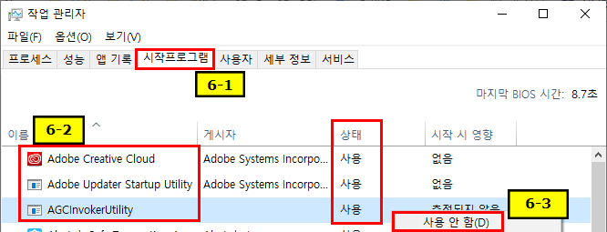 6.3 3개 프로그램 우클릭 후 "사용 안 함"으로 상태 전환