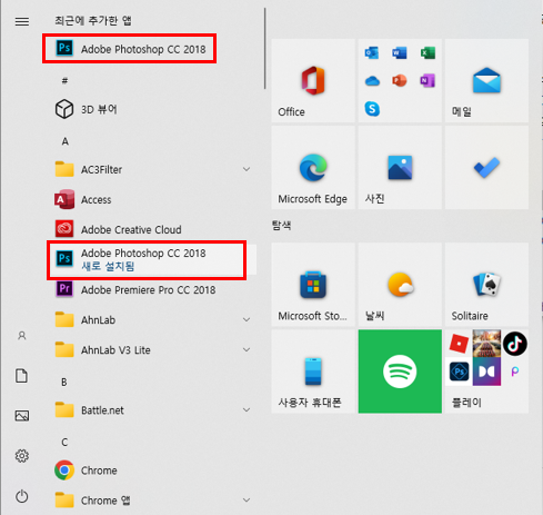 8. Adobe Photoshop CC 2018 설치내역 확인. 클릭.