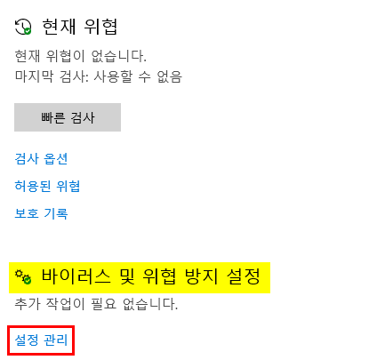 3.3 바이러스 및 위협방지 설정 ▶ 설정 관리 클릭